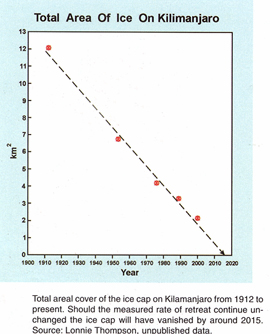 Thompson said his survey, compared with previous mapping shows 33 per cent of Kilimanjaro's ice has disappeared since 1980. Since 1912, 82 per cent of the ice has gone. "I think there is a real possibility that ice will be gone by 2015," he said. Thompson bases his estimates on the Earth continuing to warm at an accelerated rate, rising by 1.4 to 6 degrees over the next 100 years, as predicted by the International Panel on Climate Change.